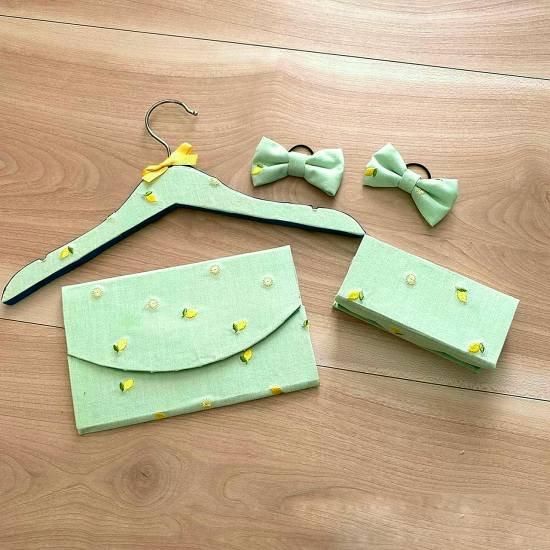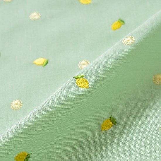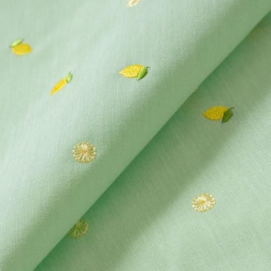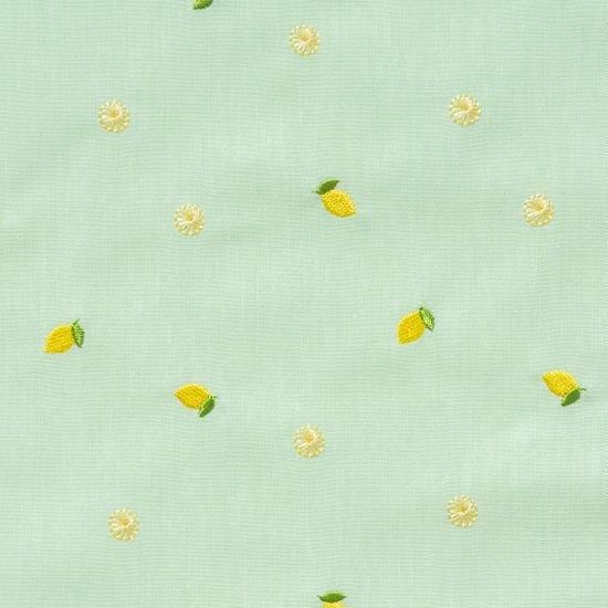 スプリンググリーンの生地にまぶしいイエローのレモン刺繍。